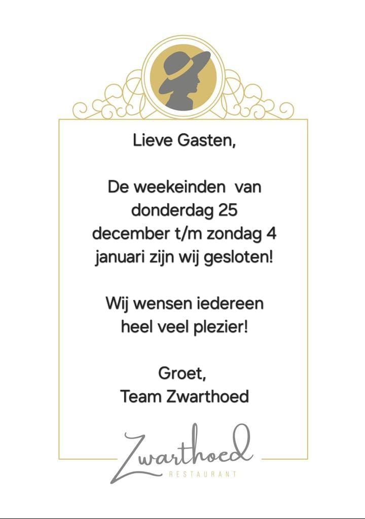Home > Weekmenu Volg ons op Weekmenu Lieve Gasten. Vanaf donderdag 8 januari zijn wij weer geopend! Bij het (online of telefonisch) reserveren kunt u uw allergieen en dieetwensen doorgeven! Culinaire verrassing Geef een cadeaubon!